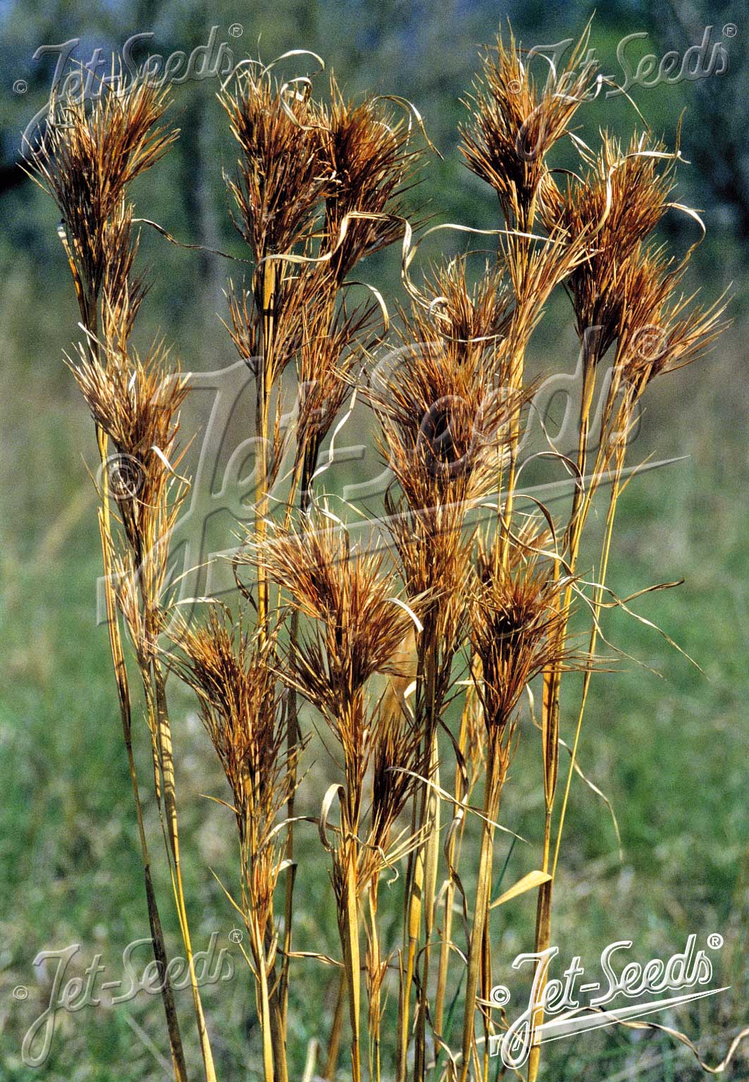 Bushy bluestem, Bushy beardgrass. An erect, tufted perennial grass with clustered spikes of green-blue foliage which turn to a coppery-orange in the autumn. Decorative bushy, silver-white seed heads appear in September these can be used in cut or dried flower arrangements. Height 1.8m. Spread 90cm. Prefers full sun, moist soil. Hardy.