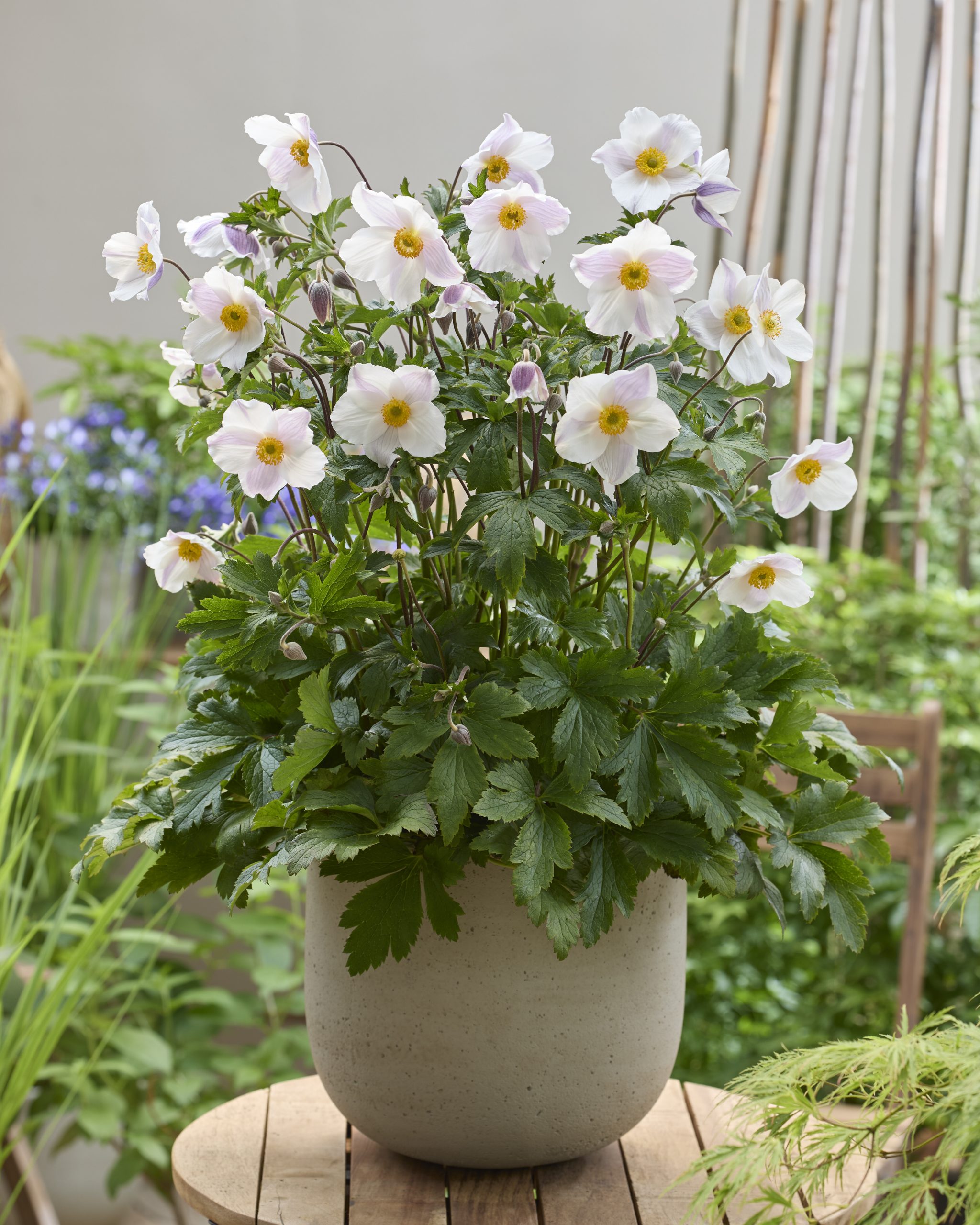 Anemone ‘Dancing Swan’ is a clump-forming perennial producing elegant white flowers with lavender-blue backs from early summer into autumn. It is ideal for borders and naturalistic planting schemes where it adds long-lasting colour and movement.