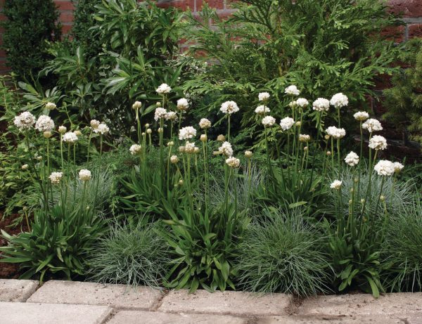 Compact and uniform plants produce cushion-shaped, grassy foliage and long, strong stems topped with long lasting, white pom-pom globes. Height and Spread 30cm. Flowers June to September. Full sun, well-drained soil. Hardy. Attracts bees.