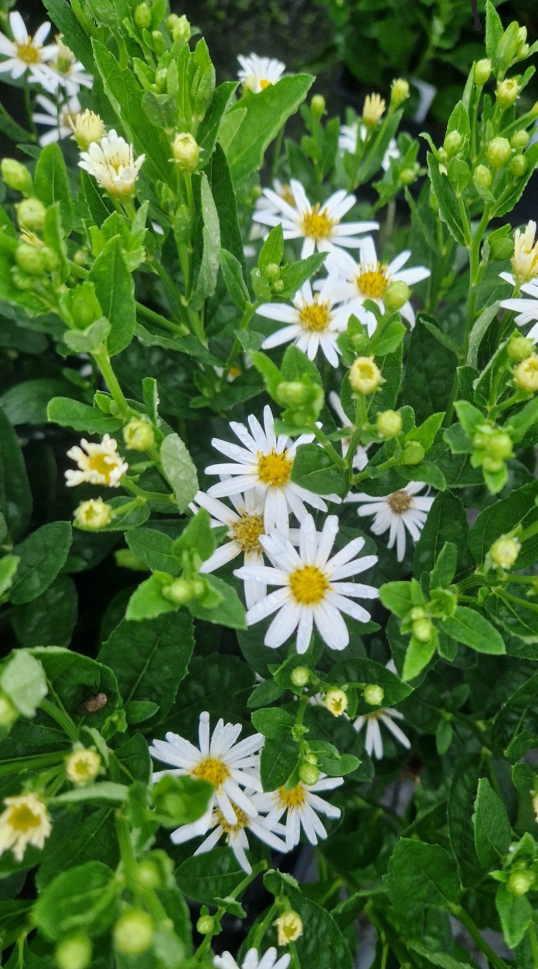 A compact, bushy, hardy perennial producing clusters of white daisies with yellow centres in late summer into autumn. Full sun/partial shade. Height and Spread 60cm. Hardy. Good mildew-resistant variety. Attracts bees.