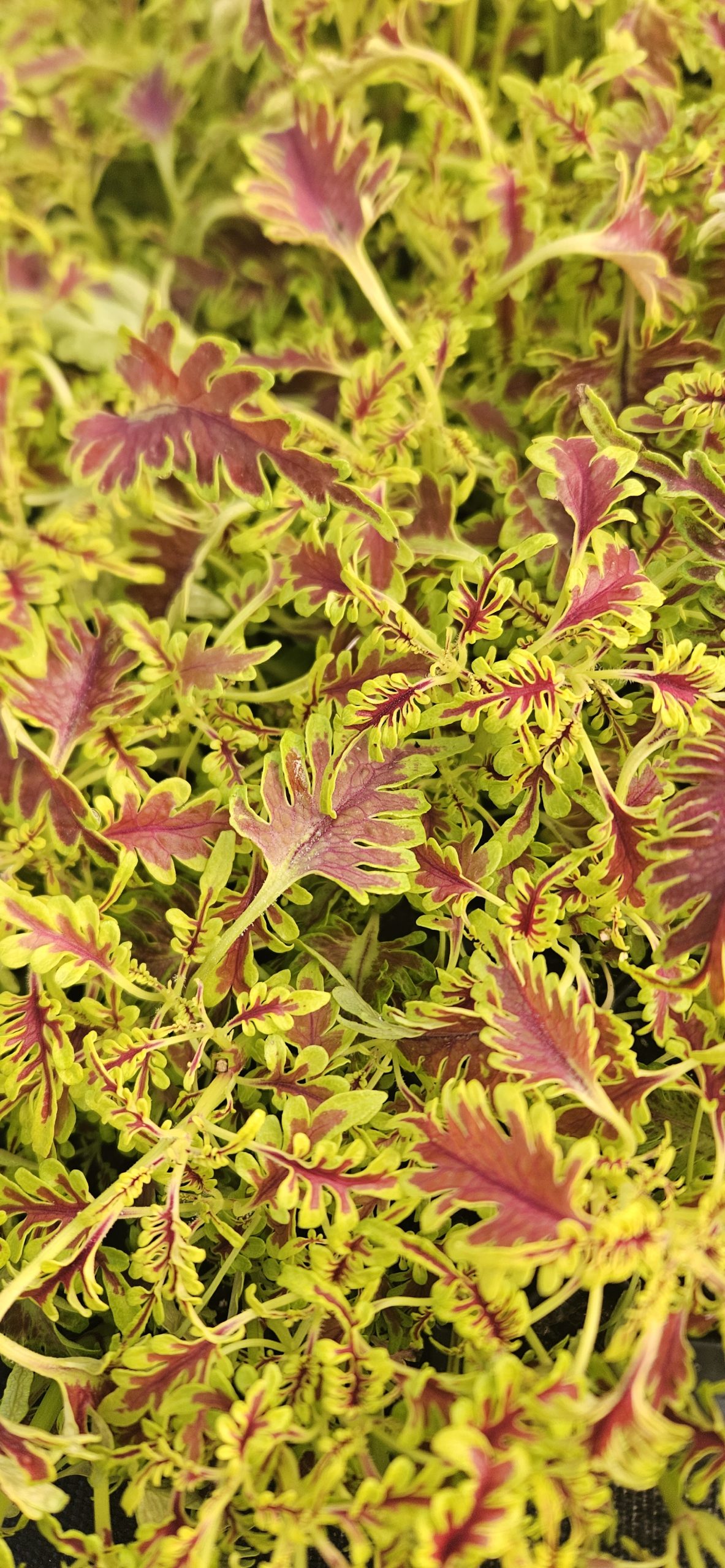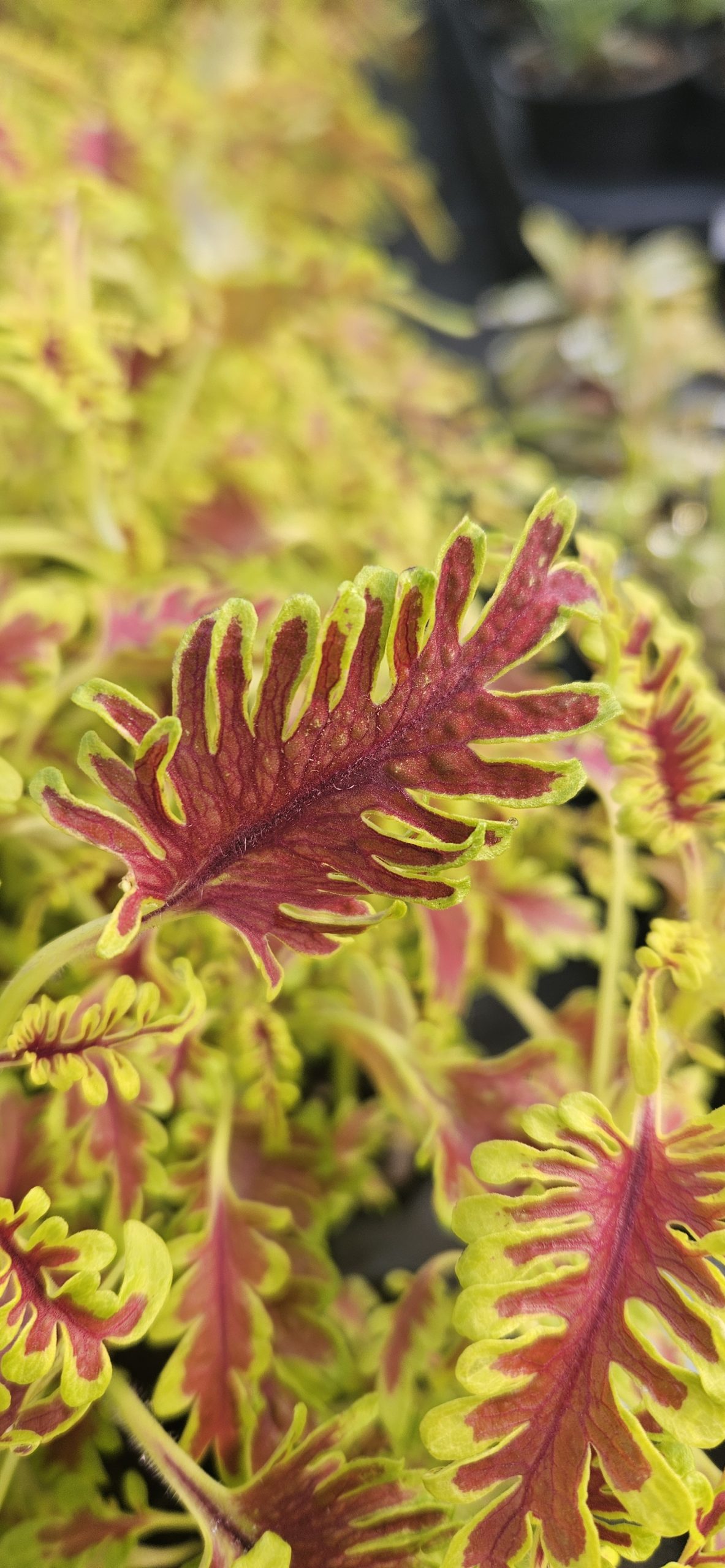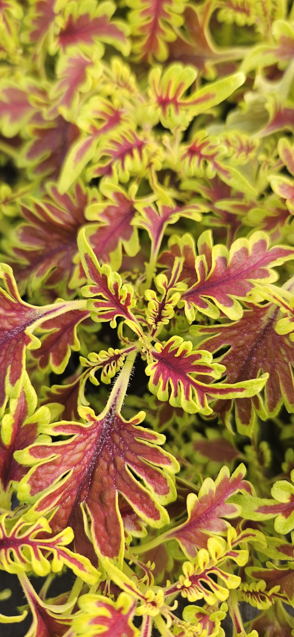 A wonderfully unique Coleus. The delicately cut, fishbone-shaped maroon foliage is tipped with vibrant lime outlines. Can be grown as an annual plant outside in summer then bought indoors as a houseplant. Height and Spread 30-35cm. Sun, part shade, well-drained soil.