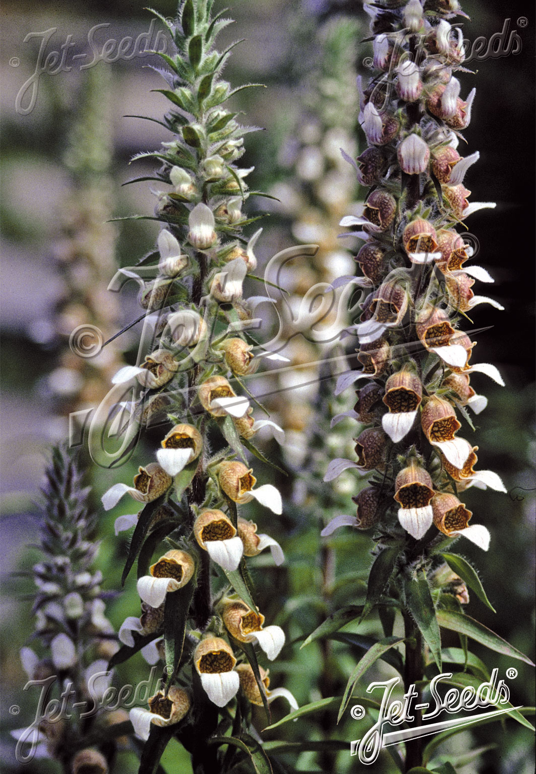 An unusual foxglove with woolly stems covered in caramel-brown flowers with a white lip and a gold and rust-brown patterning inside the throat. Flowers from May to July. Height 60cm. Spread 30cm. Full sun/partial shade. Well-drained soil. Hardy. Attracts bees.