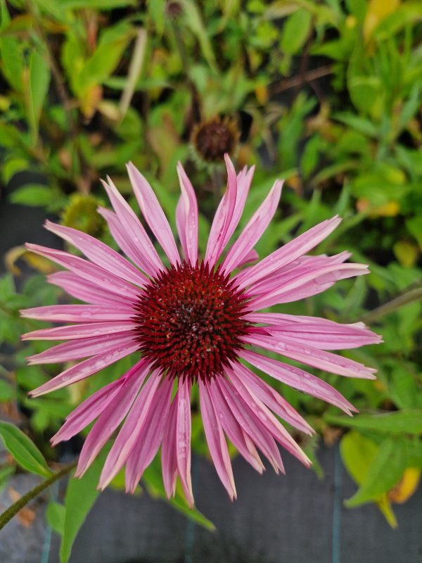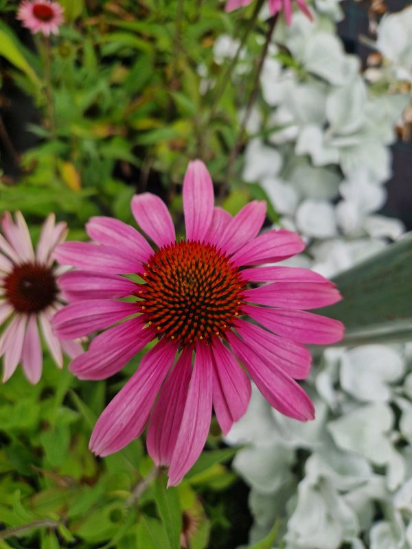 A clump forming perennial with stout stems of large, rose-pink daisy-like flower heads with a cone-shaped golden-orange disc. Height 90cm. Spread 60cm. Flowers July to September. Full sun, well-drained soil. Attracts bees and butterflies. Hardy.