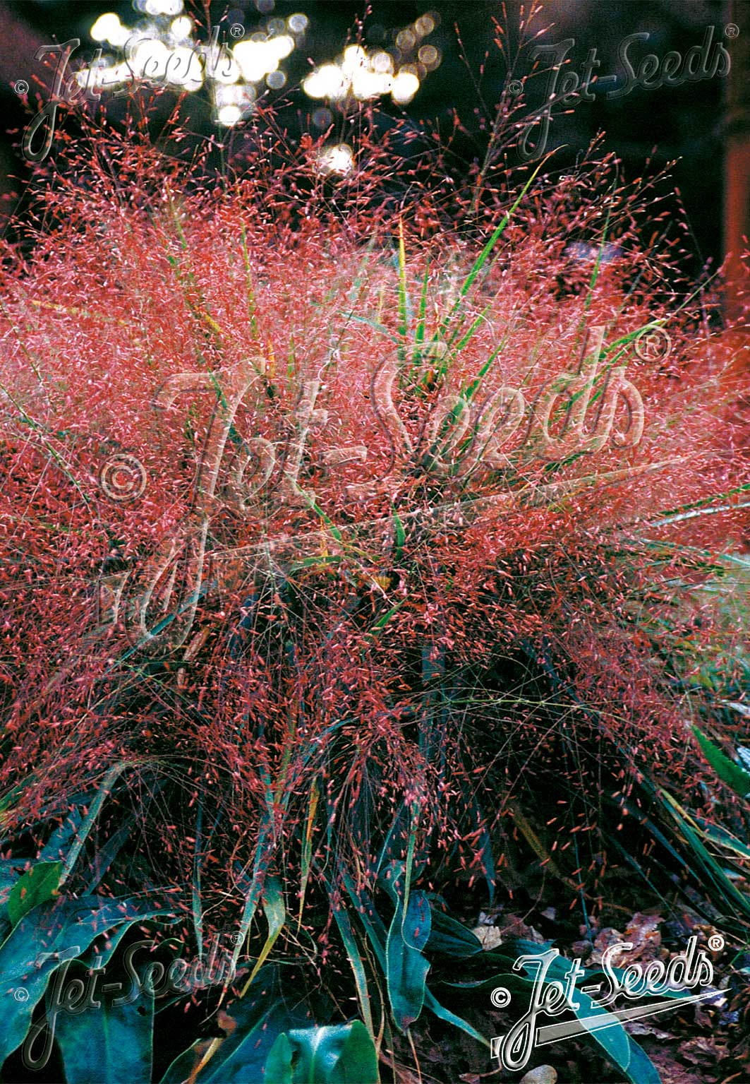 Purple Lovegrass. A clump-forming deciduous grass with narrow green leaves which turn red in autumn. Airy clouds of dainty, red-pink flowers fade to a soft-brown. Height and Spread 60cm. Full sun. Hardy.