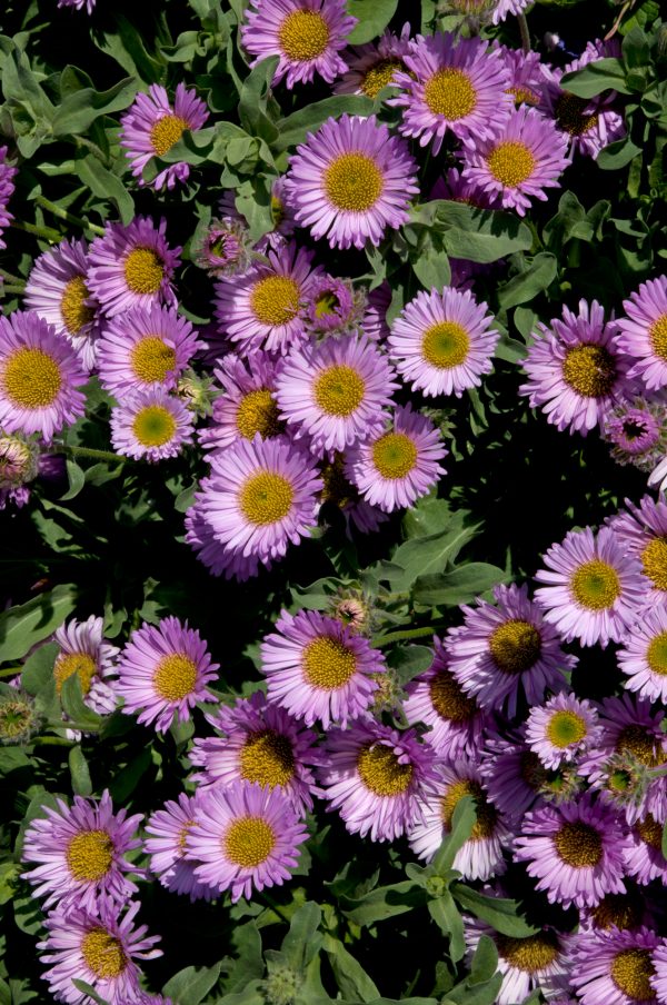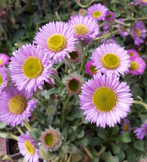 A low growing spreading perennial with blue/grey leaves and striking lavender pink semi-double daisy like flowers, with yellow discs at their centre. Flowers right through the summer and self seeds freely. Height 30cm. Spread 45cm. Full sun. We drained soil.
