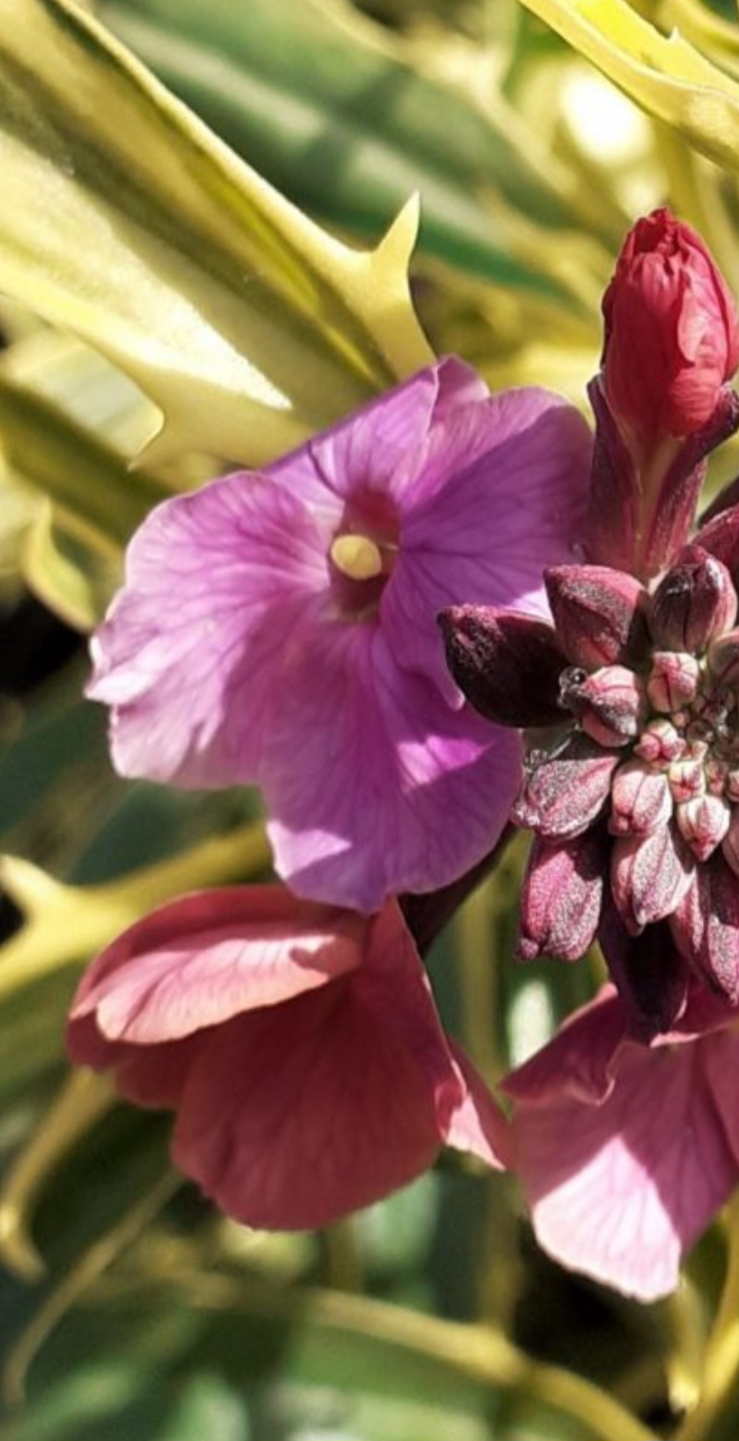 Perennial wallflower. A perennial with narrow variegated leaves. Small clusters of fragrant, rich pinky red-mauve to deep purple flowers. Height and Spread 45cm. Flowers March to September. Full sun, free-draining soil. Hardy.