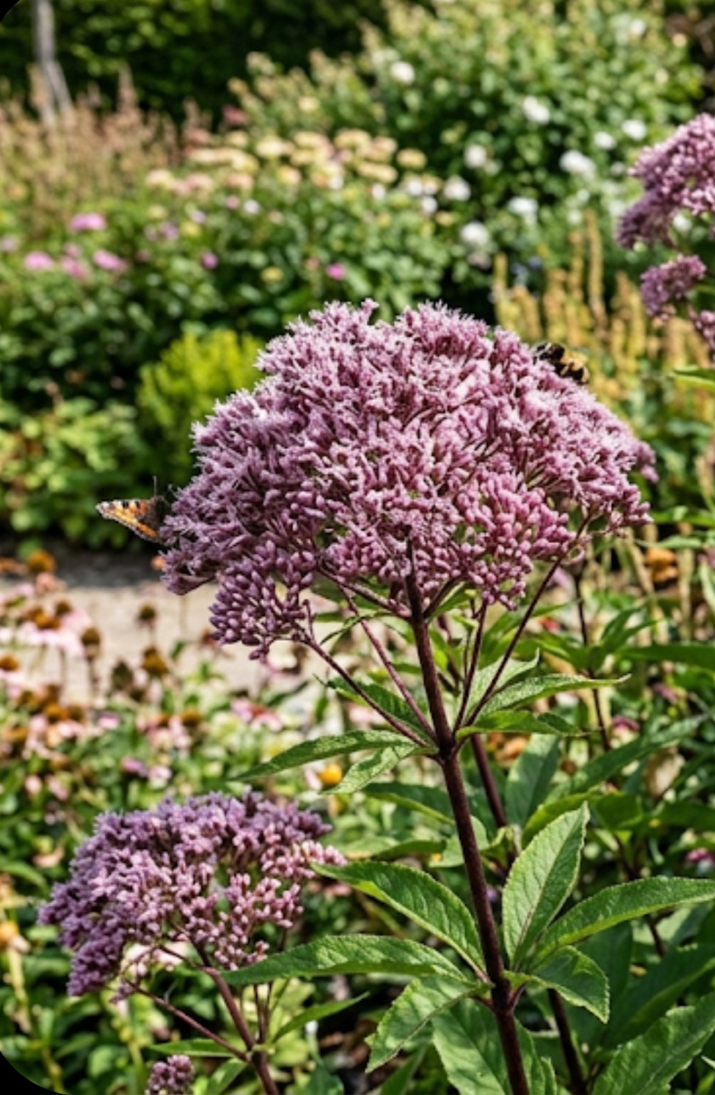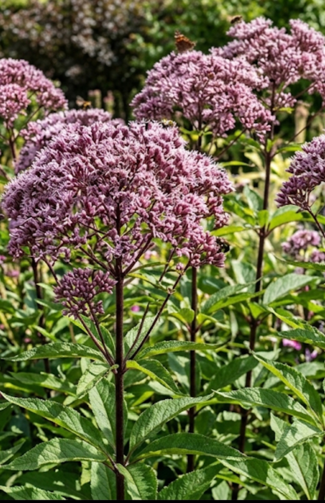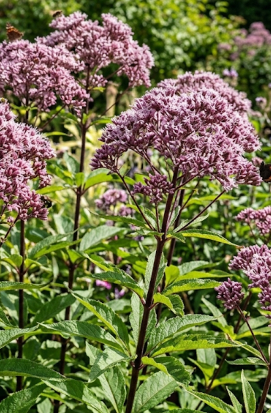 Eutrochium maculatum ‘Eureka’ is a compact, clump-forming perennial with domed clusters of vibrant purple-pink flowers on attractive maroon stems. It is ideal for borders, wildlife gardens, and areas with moisture-retentive soil.