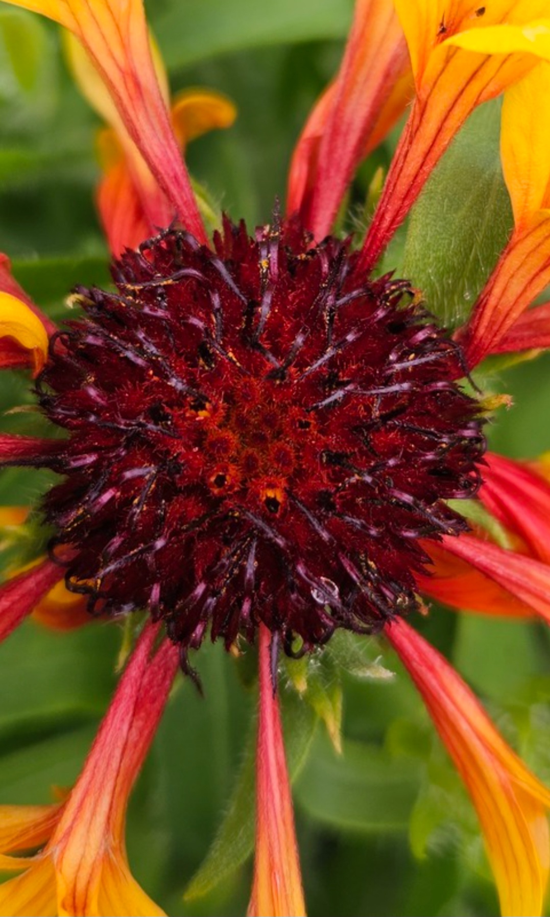 Blanket Flower. Tubular petals of strong amber-orange tones fading to yellow-orange tips with a large russet eye over a low mound of green leaves.Tolerant of poor soil and hot sun. Long flowering period. Height and Spread 45cm. Flowers June to October. Full sun, well-drained soil. Hardy. Attracts bees.
