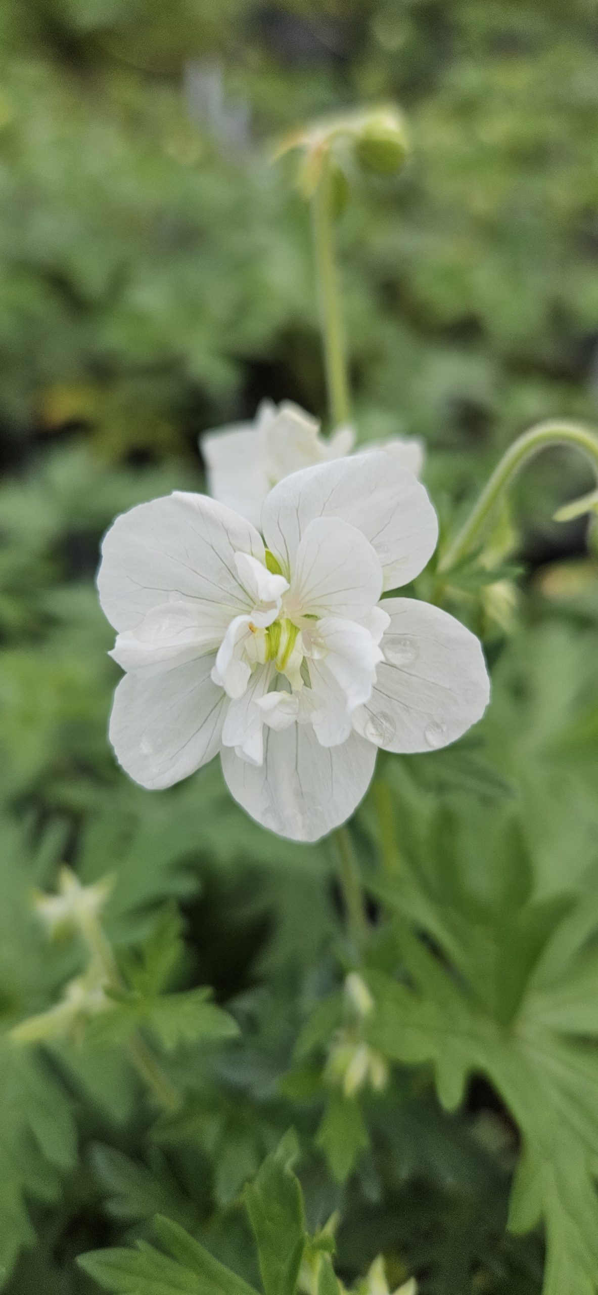 Hardy Geranium A beautiful double form, the delicate pure white flowers are held well above finely dissected mid-green leaves. Height and spread 60cm. Flowers from June to September. Full sun/partial shade. Hardy.