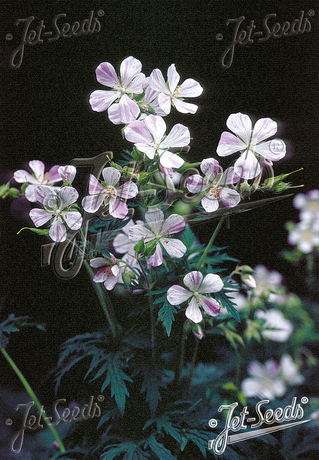 Hardy Geranium. An eye-catching geranium with large white flowers splashed with lavender-blue. Height and Spread 50cm. Long flowering from June to September. Full sun/partial shade. Hardy.