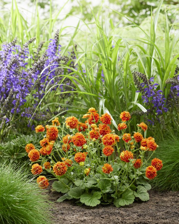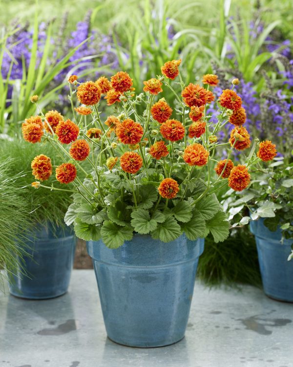 A neat, compact, clump-forming perennial with upright stems of ruffled, fully-double, flaming-orange flowers. Height and Spread 30cm. Flowers from May to September. Full sun/part shade. Fertile, well-drained, moisture-retentive soil. Hardy.