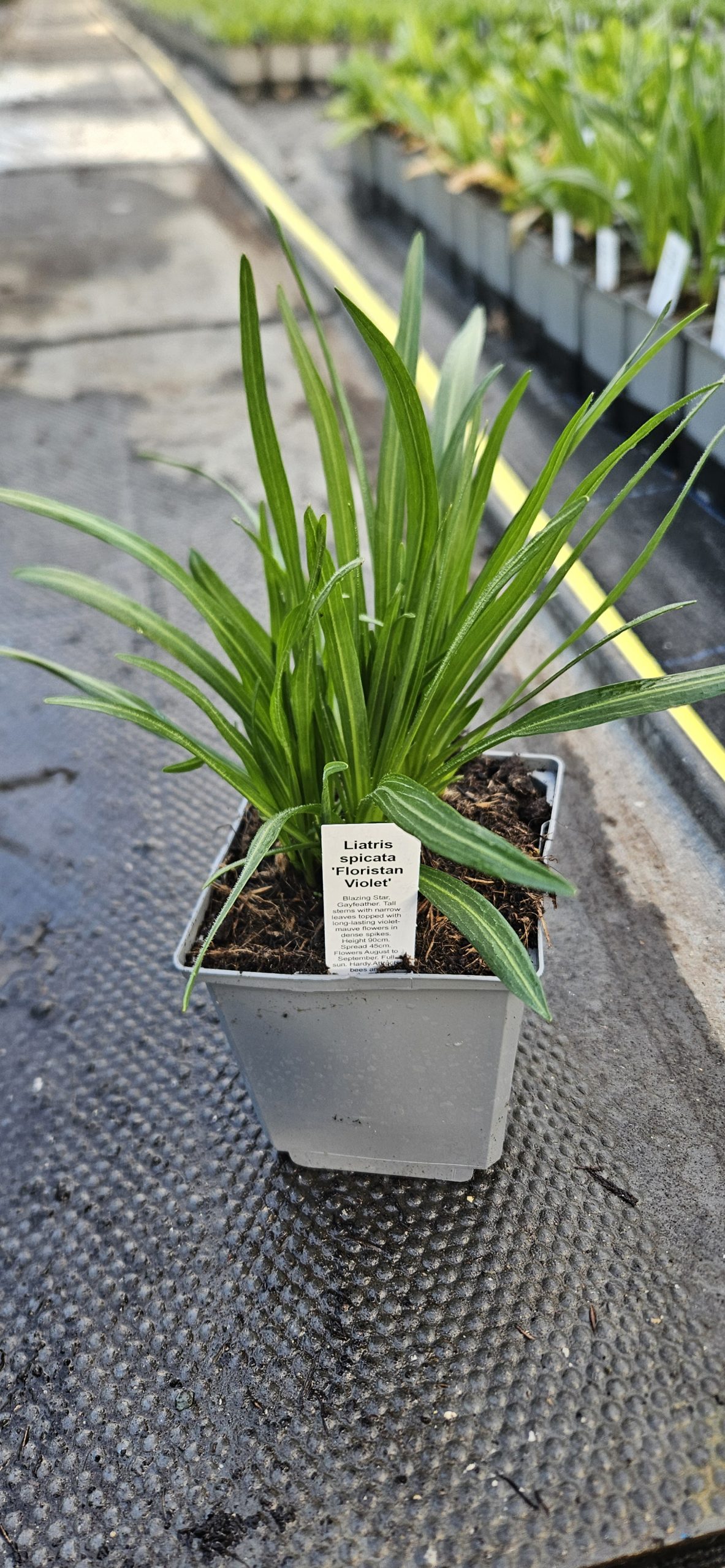 Blazing Star, Gayfeather. Tall stems with narrow leaves topped with long-lasting violet-mauve flowers in dense spikes. Height 90cm. Spread 45cm. Flowers August to September. Full sun. Hardy. Attracts bees and butterflies.