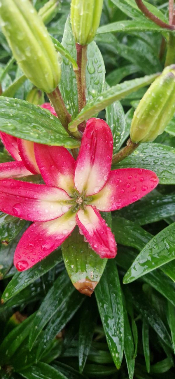 Asiatic lily. Large, upward facing white flowers flushed pink towards the tips. Height 80cm. Free draining soil. Full sun. Hardy.