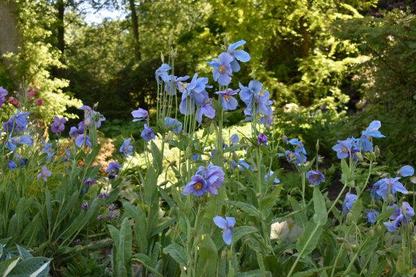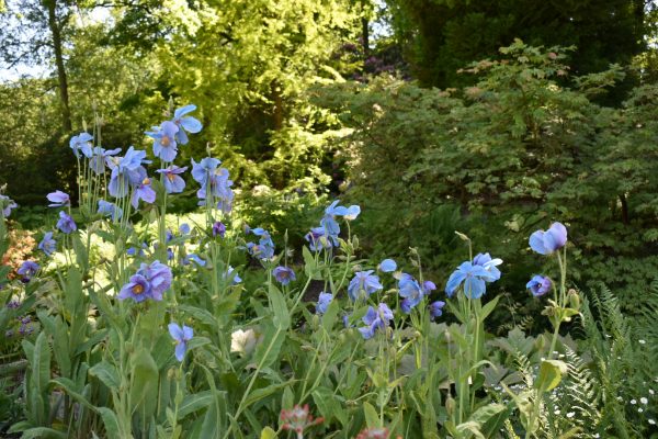 Himalayan Blue Poppy. A choice perennial with rosettes of light bluish green hairy leaves. Beautiful saucer-shaped china blue flowers with yellow stamens in early summer. Max Height 1m. Max Spread 45cm. Flowers June to July. Partial shade. Hardy.