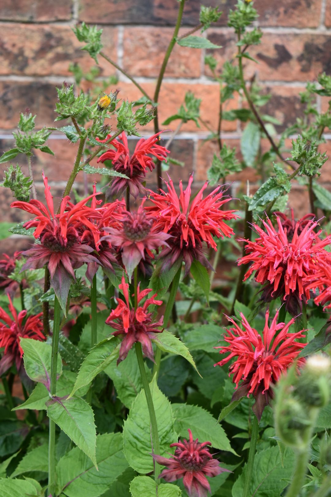 Bee Balm. An aromatic clump-forming perennial with rich scarlet-red flowers in mid to late summer. Height 90cm. Spread 45cm. Flowers July to September. Full sun/dappled shade. Moist, well-drained soil. Hardy. Attracts bees and butterflies.