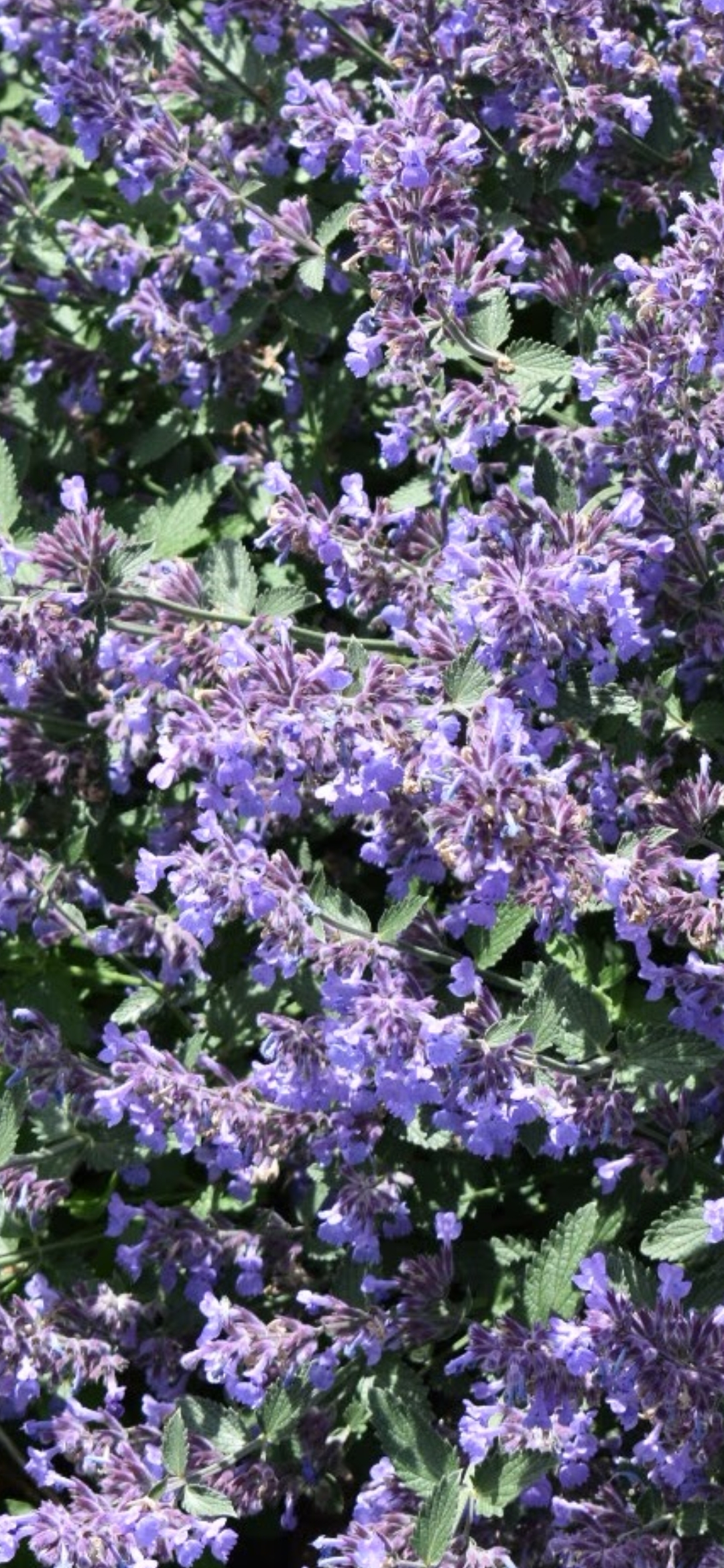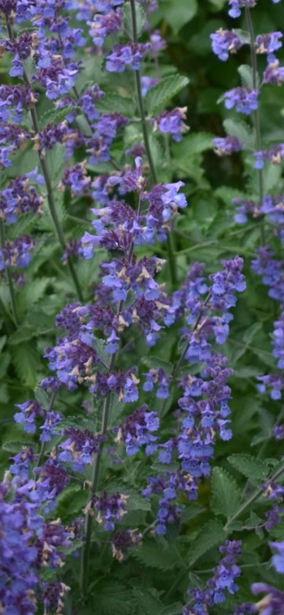Catmint. A vigorous perennial with aromatic light grey-green leaves and abundant lavender-blue flower spikes. Height 90cm. Spread 60cm. Flowers June to August. Full sun/partial shade. Hardy.