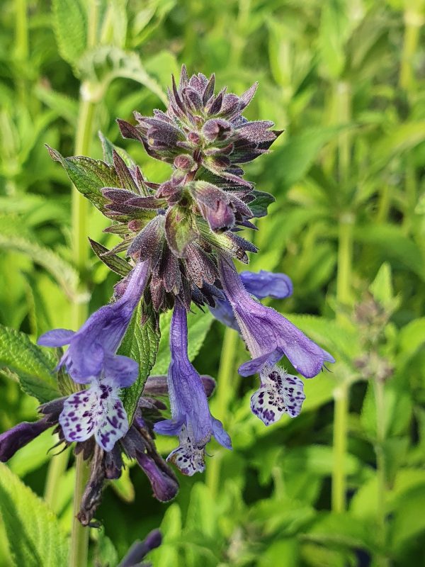 Catmint. A clump-forming perennial with aromatic, bright green leaves and delicate purple flowers with dark speckles on tall stems from mid summer to autumn. Height 80cm. Spread 60cm. Full sun/light shade, free-draining soil. Attracts bees and butterflies. Hardy.