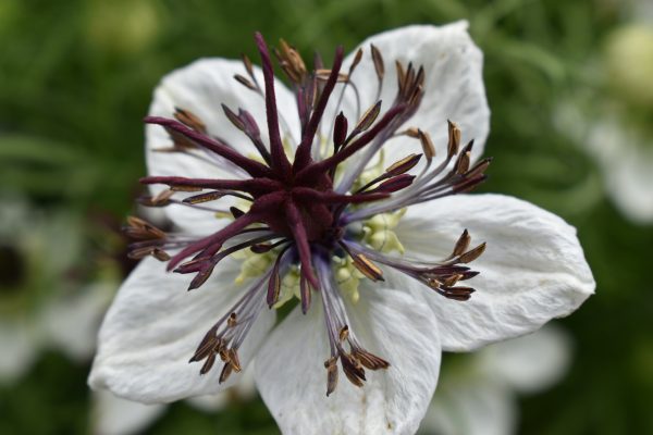 A beautiful variety with large, pure-white blooms with a contrasting centre of rich purple stamens, followed by decorative seed pods. Attractive fine, feathery foliage. Height 60cm. Spread 30cm. Flowers June to September. Full sun, well-drained soil. Hardy Annual.
