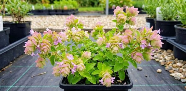 A beautiful ornamental with masses of hop-like clusters of pink and green bracts with lilac-pink flowers from June to September. Aromatic, bright green leaves. Perfect for a sunny border, rockery or a patio container. Height and Spread 50cm. Full sun. Free-draining soil.