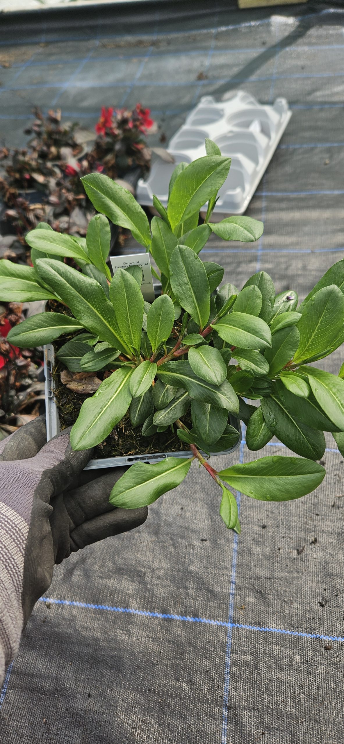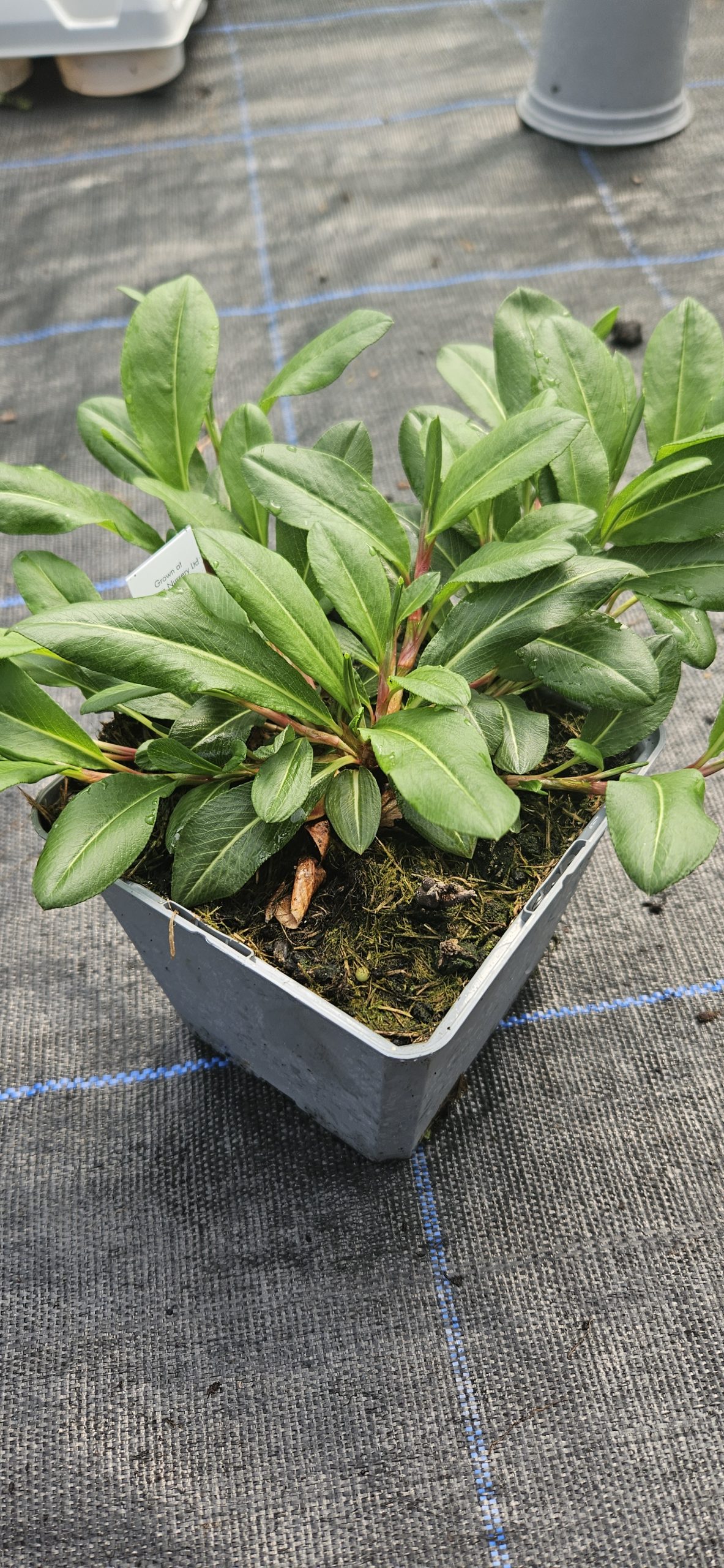 A mat-forming, semi-evergreen perennial with dark, slim green leaves turning red in autumn. Short spokes of pink flowers turning red when mature. Height 45cm. Spread 75cm. Flowers July to October. Full sun/partial shade. Hardy.