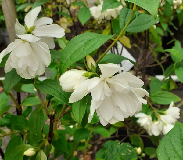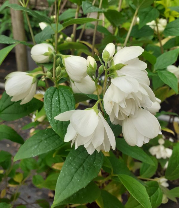 Mock Orange. An arching shrub with dark, glossy leaves which provide the perfect backdrop to show off clusters of double, very fragrant, pure white flowers. Height and spread 1.2m. Flowers from June to July. Full sun/partial shade. Any moist, well drained soil. Hardy.