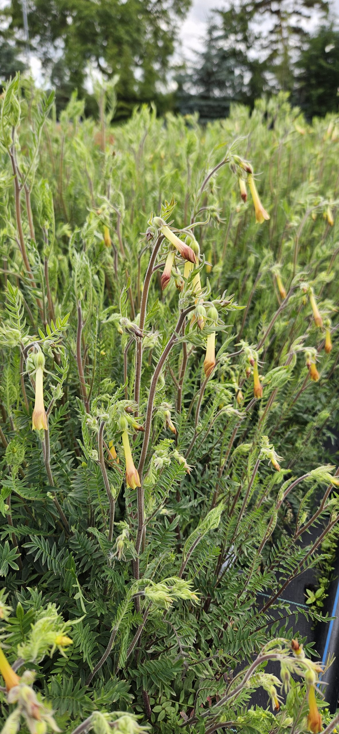 An unusual perennial with long, slender buttery-yellow trumpet-shaped flowers tinged red, over delicately divided feathery foliage from May to July. Height 40cm. Spread 20cm. Full sun/partial shade, moist, well-drained soil. Hardy.