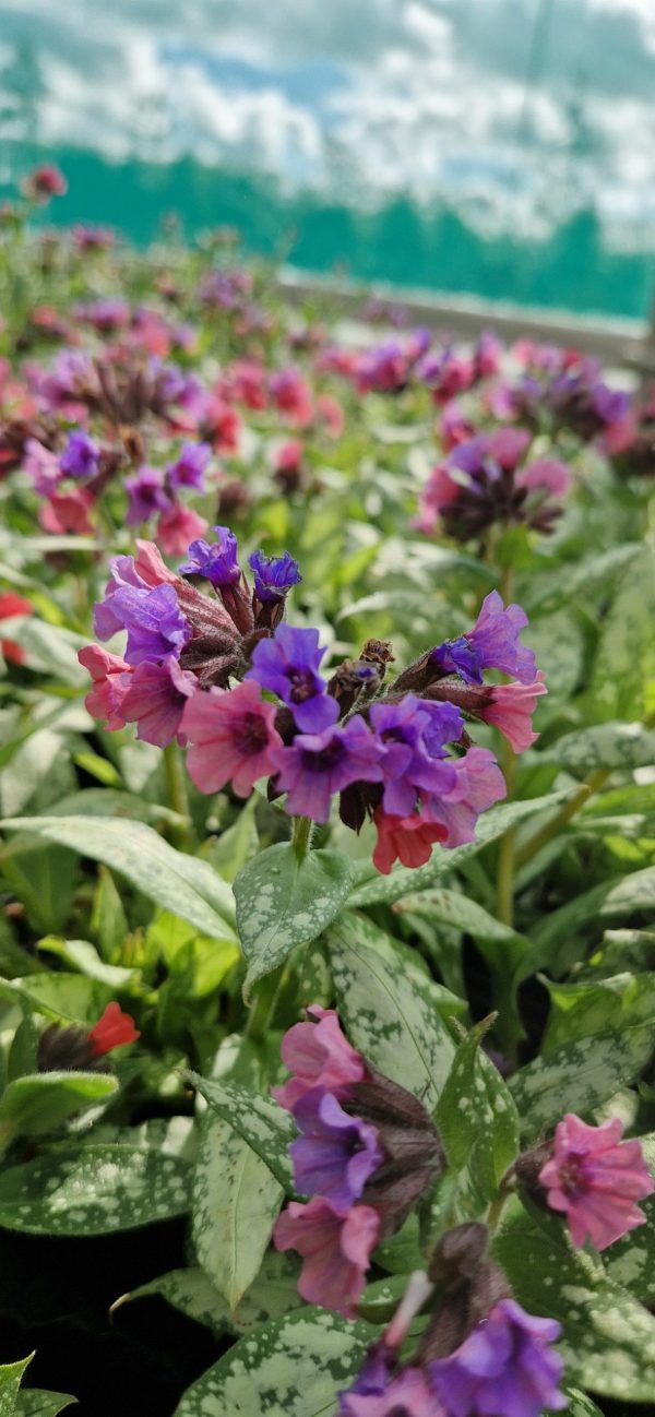 A clump forming perennial with slender, pointed leaves, which are heavily silvered. Clusters of flowers are held above the foliage on upright stems, opening pink, turning blue as they age. An excellent ground cover plant for part shade. Height 30cm. Spread 50cm. Flowers from March to May. Hardy.