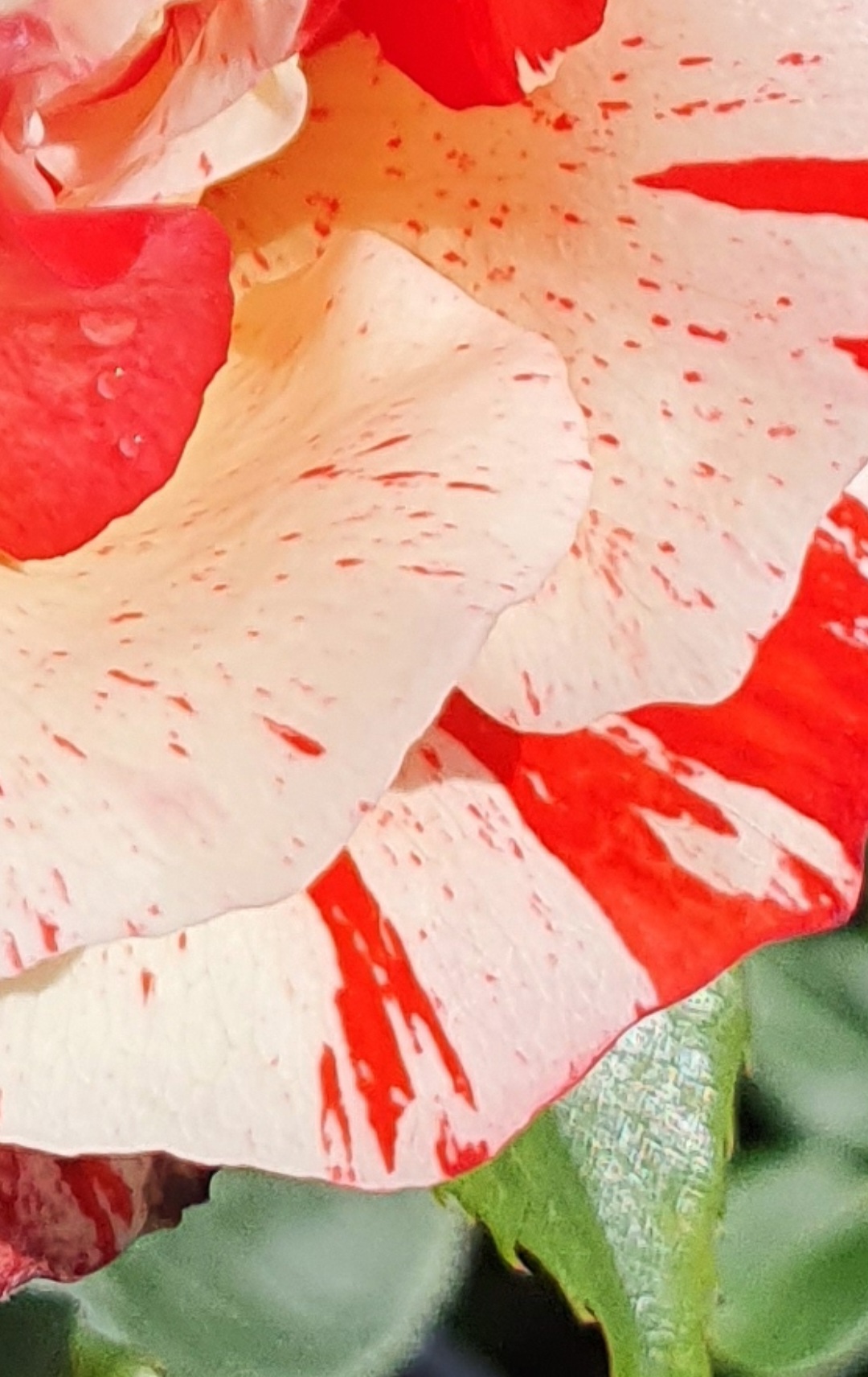 Floribunda. Striking blooms streaked with scarlet, orange and cream from summer to autumn. Height 75cm. Spread 45cm. Full sun. Hardy.