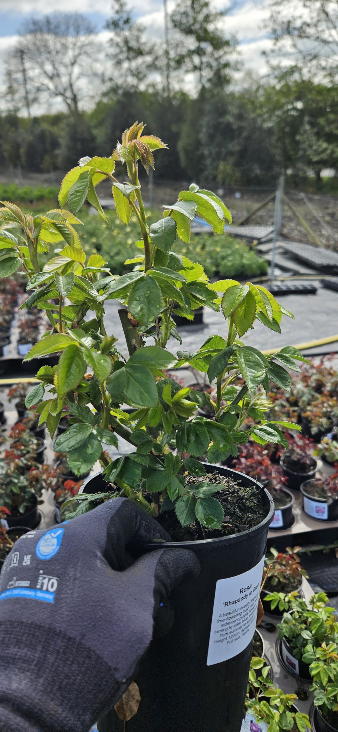 A beautiful sweet fragrant, free-flowering bush rose with glossy, large mid green leaves. Iridescent purple flowers turning to slate blue, produced from summer to autumn. Rose of The Year 2003. Height 120cm. Full sun. Hardy.