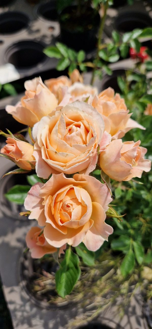 Patio. A profusion of well formed, scented, apricot-peach blooms repeat flower from summer until the first frosts. Good disease resistance. Height 45cm. Spread 35cm. Full sun. Hardy.