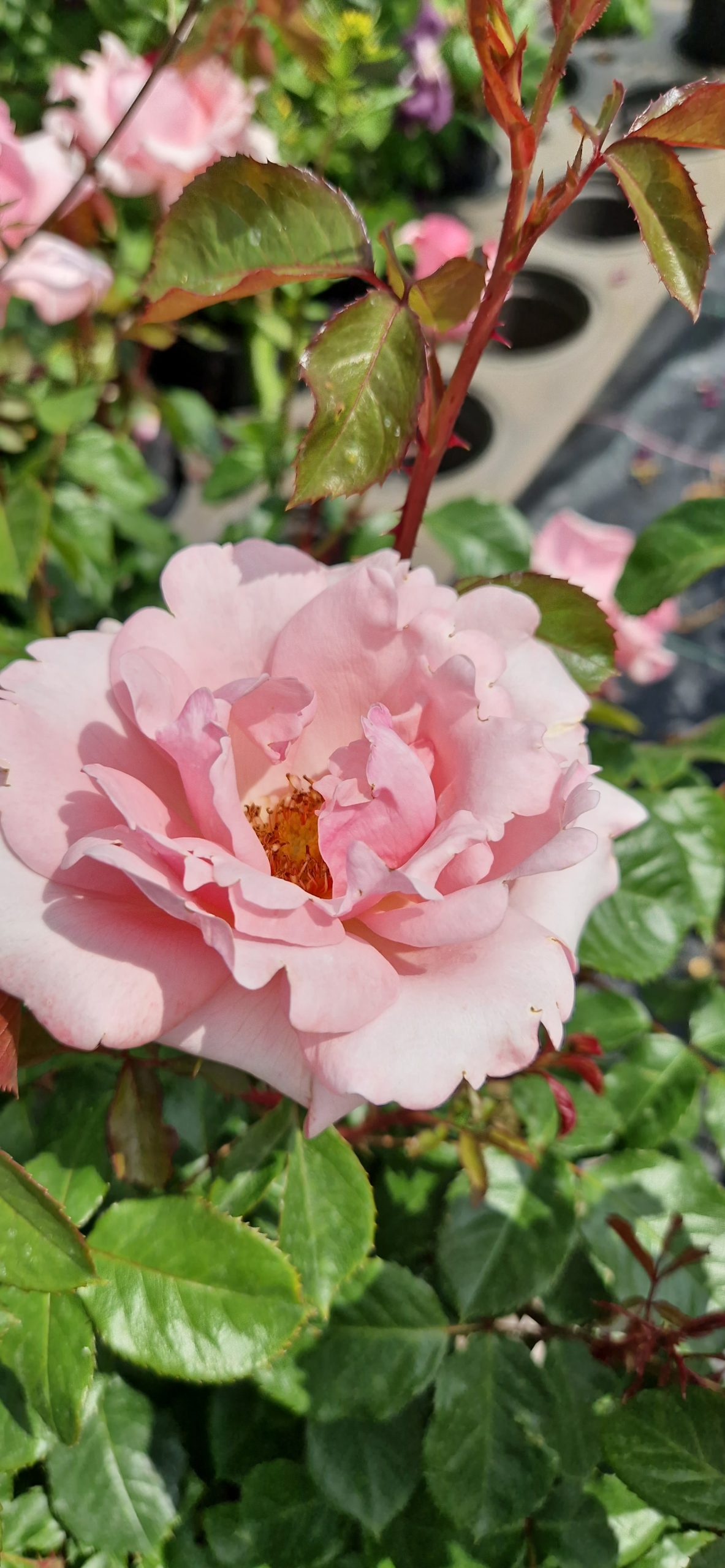 Floribunda. A very pretty free flowering rose with frilly petalled flowers. The petals are creamy pink touched with lilac, with a hint of scarlet at the base. Lightly fragrant. Repeat flowering from summer to autumn. Height and Spread 1m. Full sun. Hardy.
