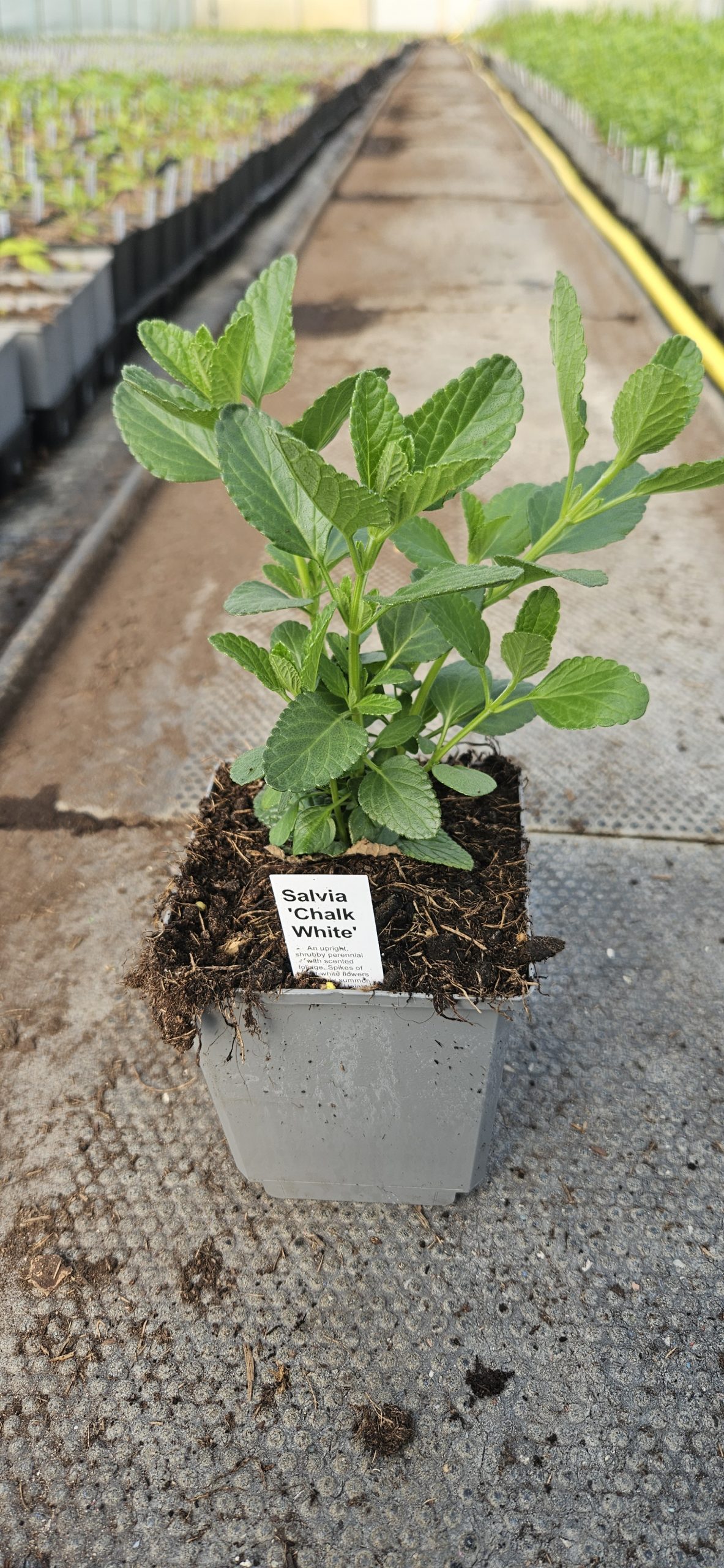 Salvia ‘Chalk White’ is a beautiful shrubby perennial featuring fragrant foliage and tall spires of pure-white flowers that bloom from early summer through autumn. With a compact height and spread of around 60cm, Salvia ‘Chalk White’ is perfect for borders, containers, and pollinator-friendly gardens.