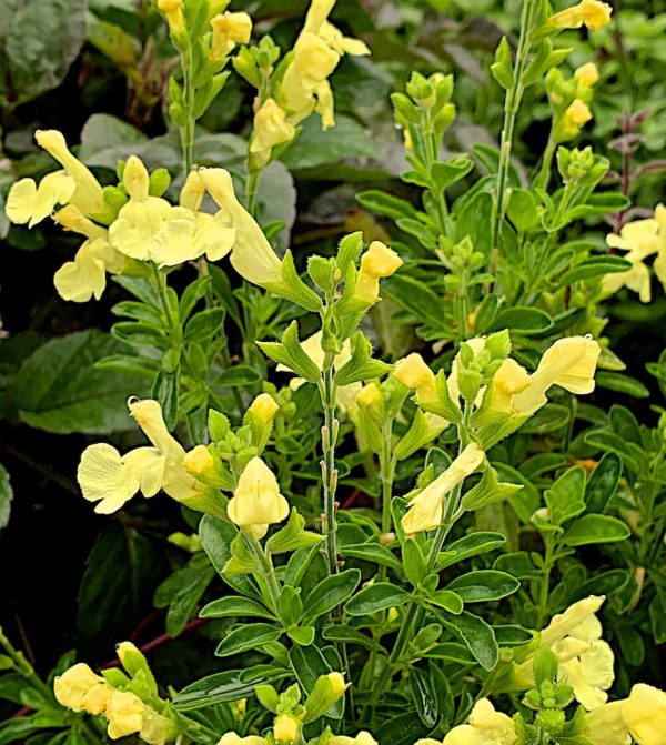 A compact, upright, bushy shrub with aromatic, oval green leaves. Pale lemon-yellow flowers on slender flower spikes from June to October. Height and Spread 60cm. Full sun/partial shade. Well-drained soil. Hardy. Attracts bees.