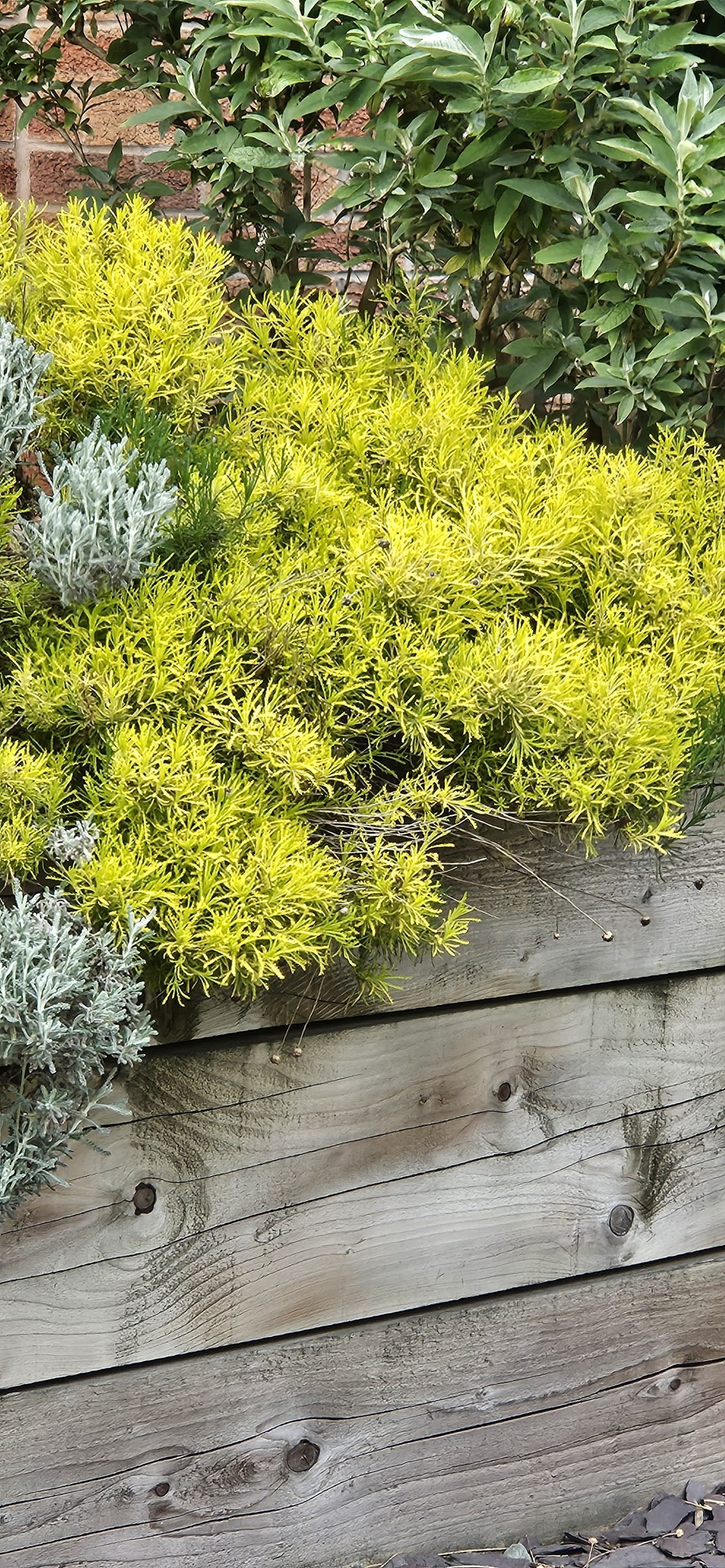 Cotton Lavender. A neat low growing mound forming evergreen shrub, with aromatic, golden lemon foliage and dainty button like cream flowers from June to July. Height and spread 50cm. Full sun. Hardy.