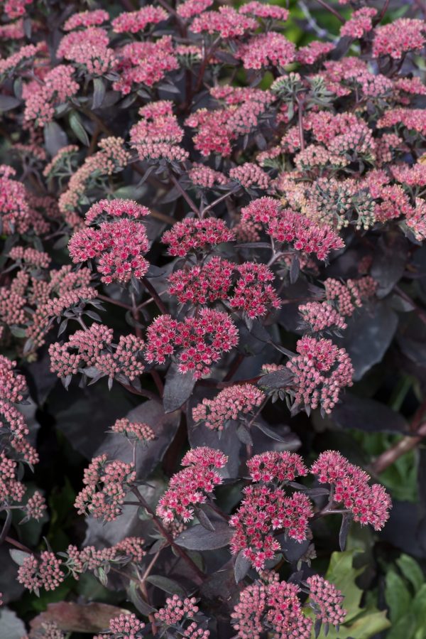 An upright, clump-forming perennial with red-brown spring foliage developing into glossy red-black in summer. The multiple crowns of flower clusters are pink and appear in July to October. Height and Spread 40cm. Full sun, well drained soil. Hardy. Attracts bees and butterflies.