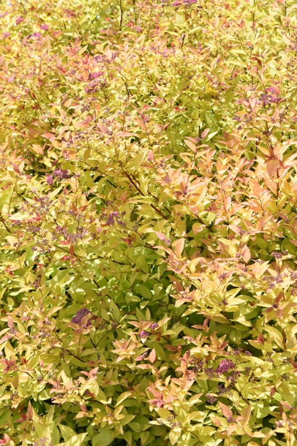 A compact, dense shrub with burnished bronze red young leaves, turning bright yellow then luminous green. Clusters of dark pink flowers from mid to late summer. Height and spread 75cm. Flowers July and August. Full sun. Hardy.