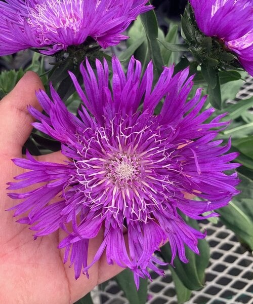 Stokesia laevis ‘Amethyst’ is a compact perennial known for its large purple flowers and evergreen foliage. Moreover, it is an excellent choice for sunny borders, gravel gardens, and pollinator-friendly planting schemes.