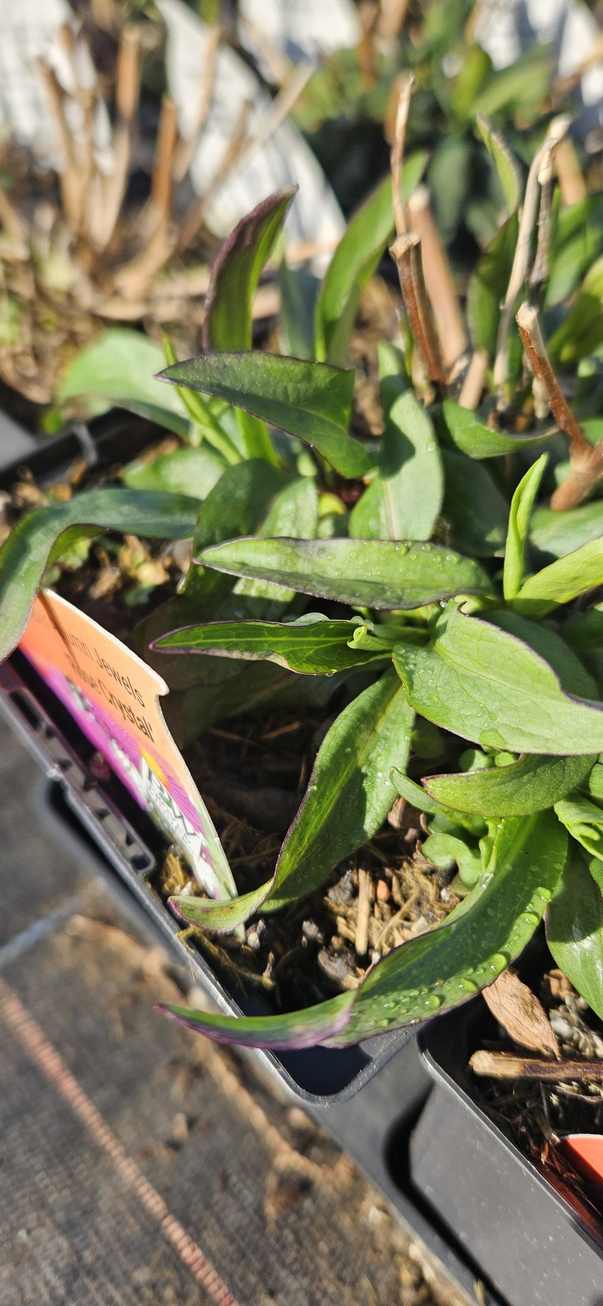 A dwarf, compact perennial with strong rose-purple, daisy-like flowers with a yellow centre that smother the plant from August to October. Height and Spread 25cm. Full sun/partial shade. Hardy. Attracts bees.