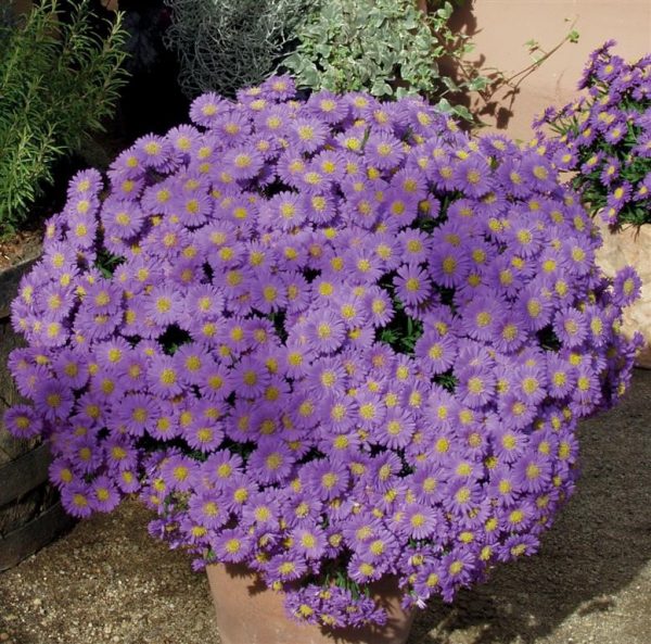 A dwarf, compact perennial with vibrant purple-blue, daisy-like flowers with a yellow centre that smother the plant from August to October. Height and Spread 25cm. Full sun/partial shade. Hardy. Attracts bees.