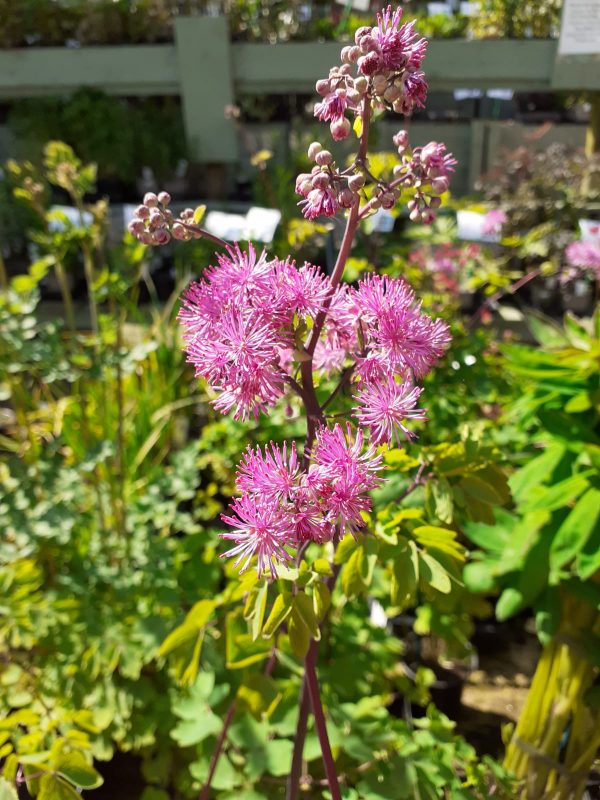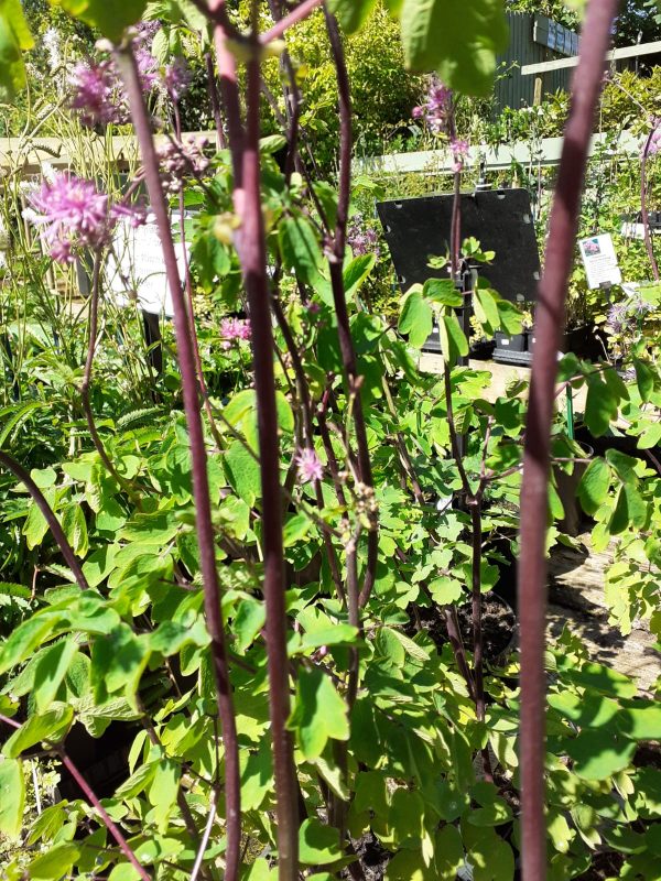 Fluffy, lavender-purple flowers held high on on striking jet-black stems above pretty, scalloped, lacy foliage. Height 2m. Spread 75cm. Flowers June to July. Full sun or dappled shade. Hardy.