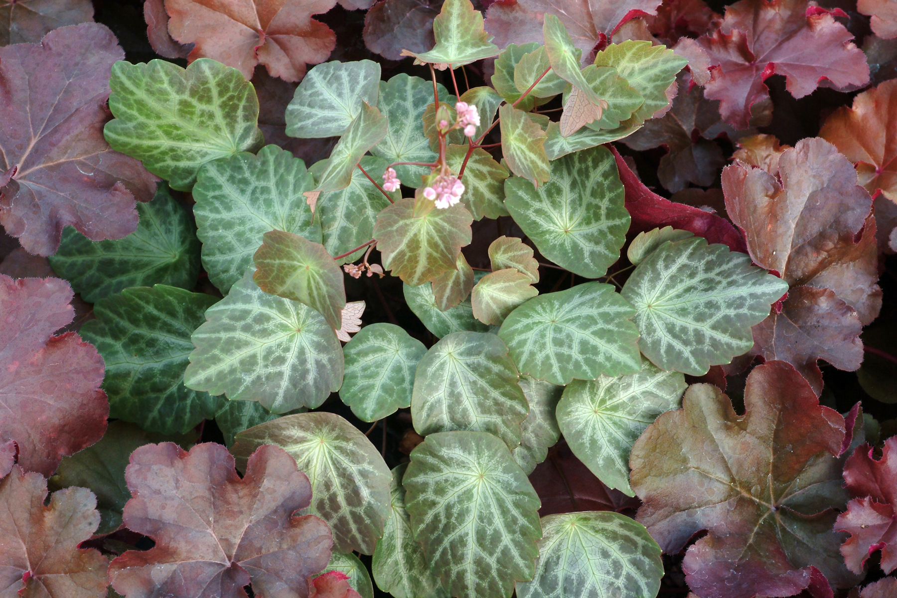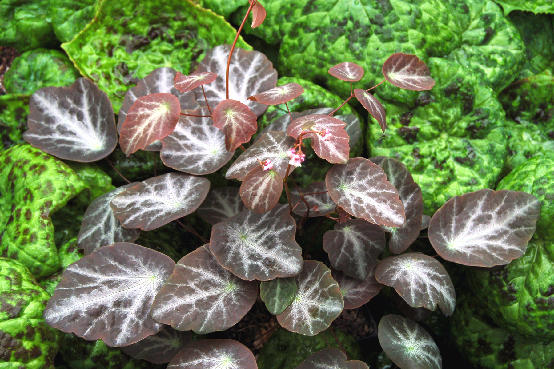 A dainty, clump-forming perennial. Fluffy, lavender coloured flowerheads float above the foliage from May to August. Ovate olive coloured leaves in spring are tinted with copper with a central silver marbled overlay, held on thin wiry stems. Height 20cm. Spread 30cm. Partial shade, rich moisture retentive soil. Hardy.