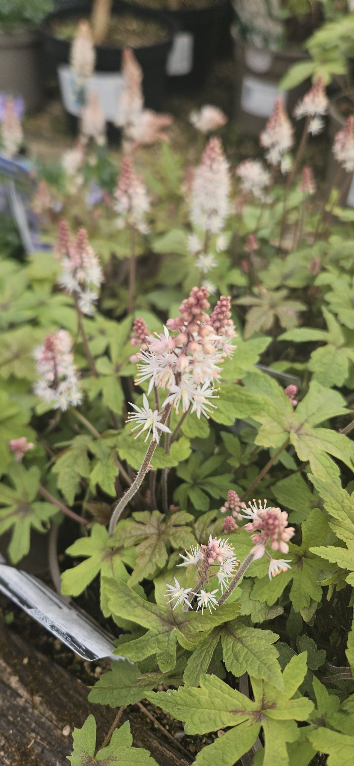 Foam Flower. A spreading perennial with attractive, compact, deeply cut foliage. Coral pink, star-shaped flowers fading to white in spring, reblooming later. Height and Spread 30cm. Flowers May to June. Shaded site. Hardy.