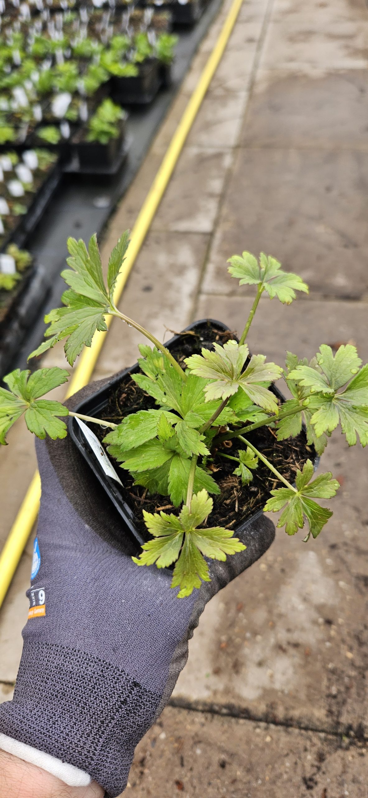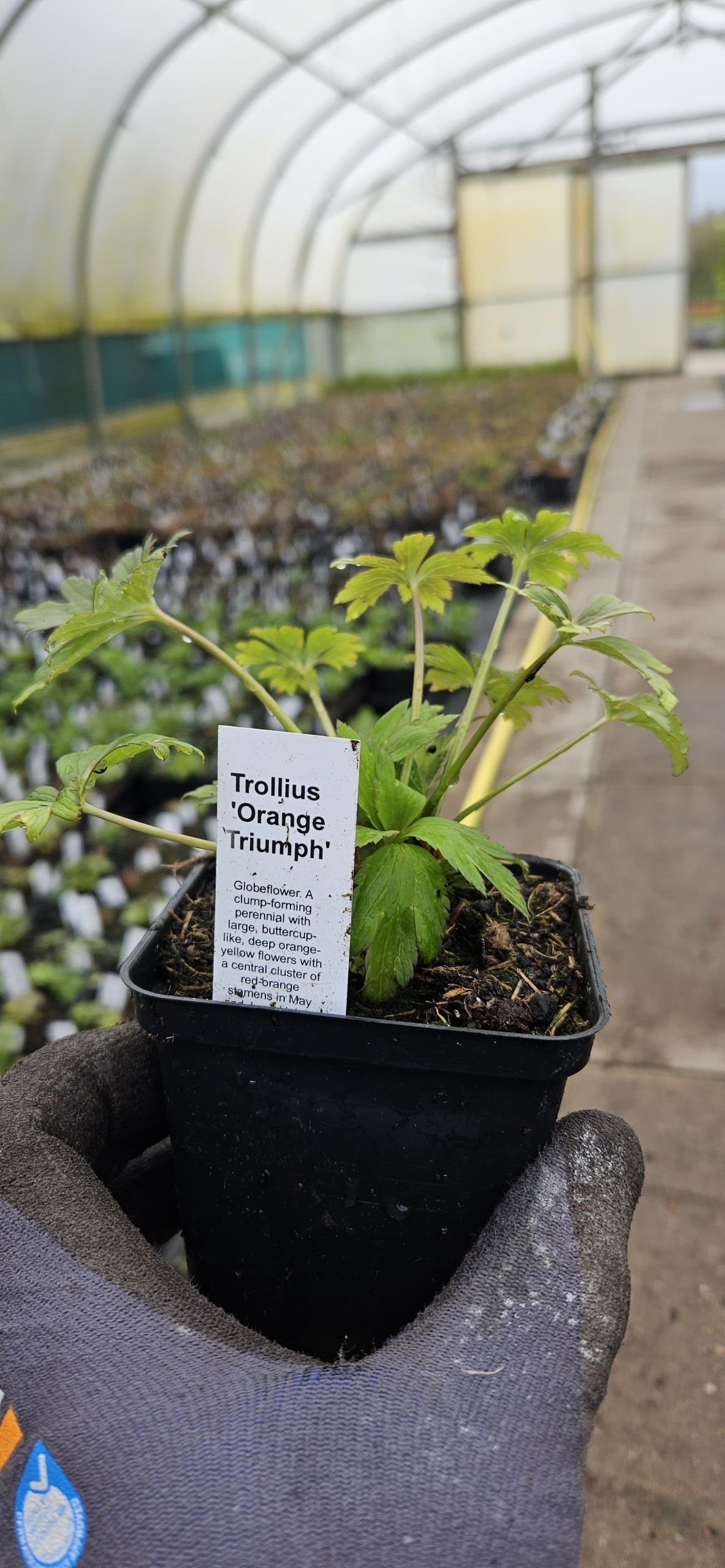 Globeflower. A clump-forming perennial with large, buttercup-like, deep orange-yellow flowers with a central cluster of red-orange stamens in May and June. Height and Spread 50cm. Full sun/partial shade. Prefers moist soil. Hardy.