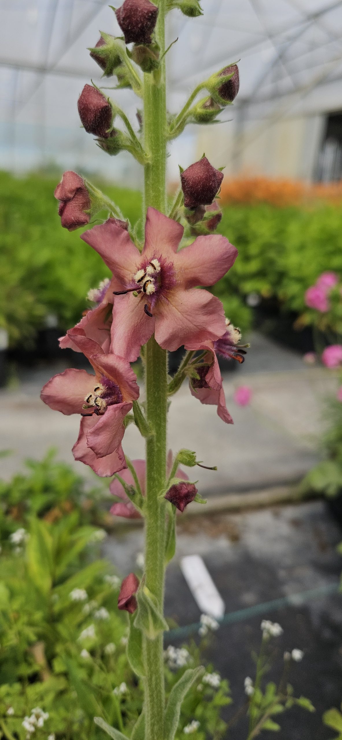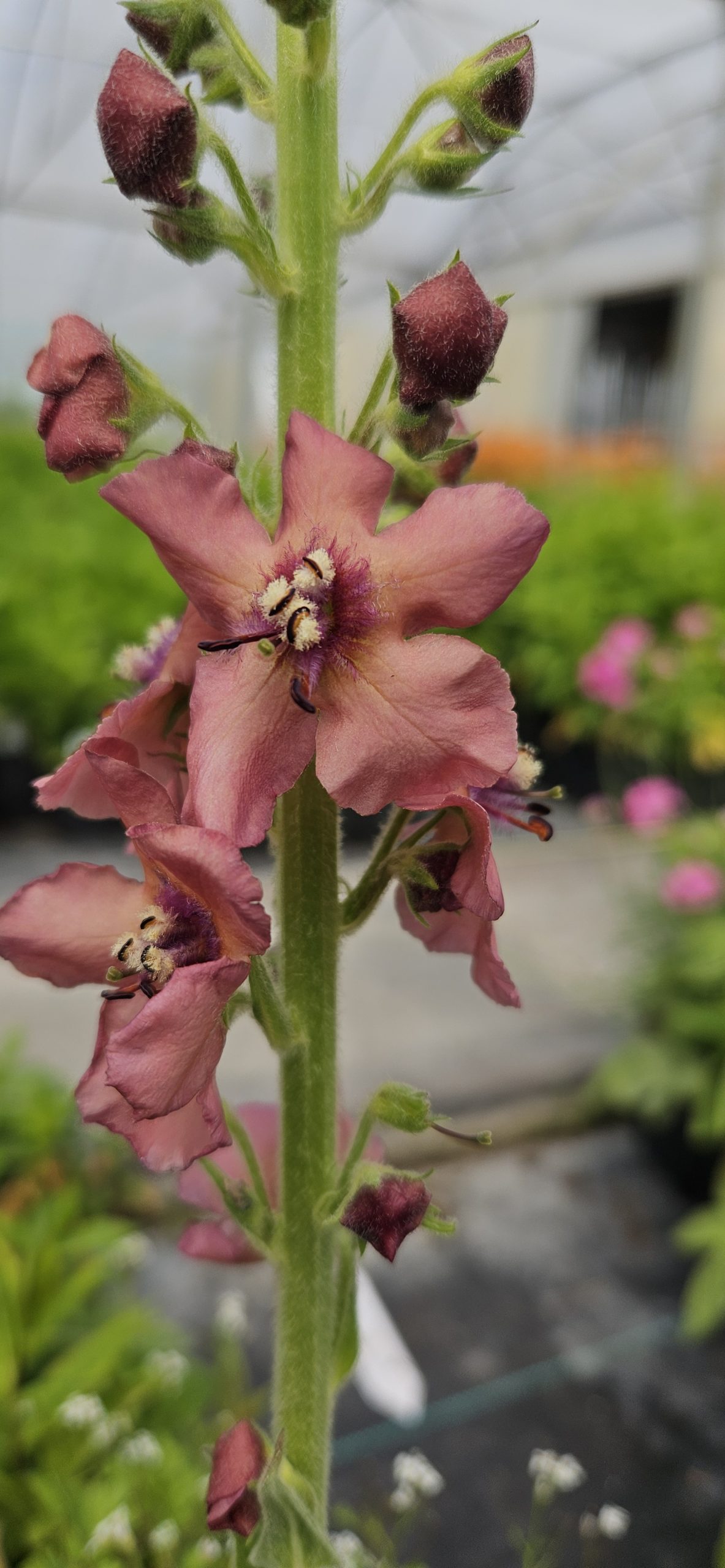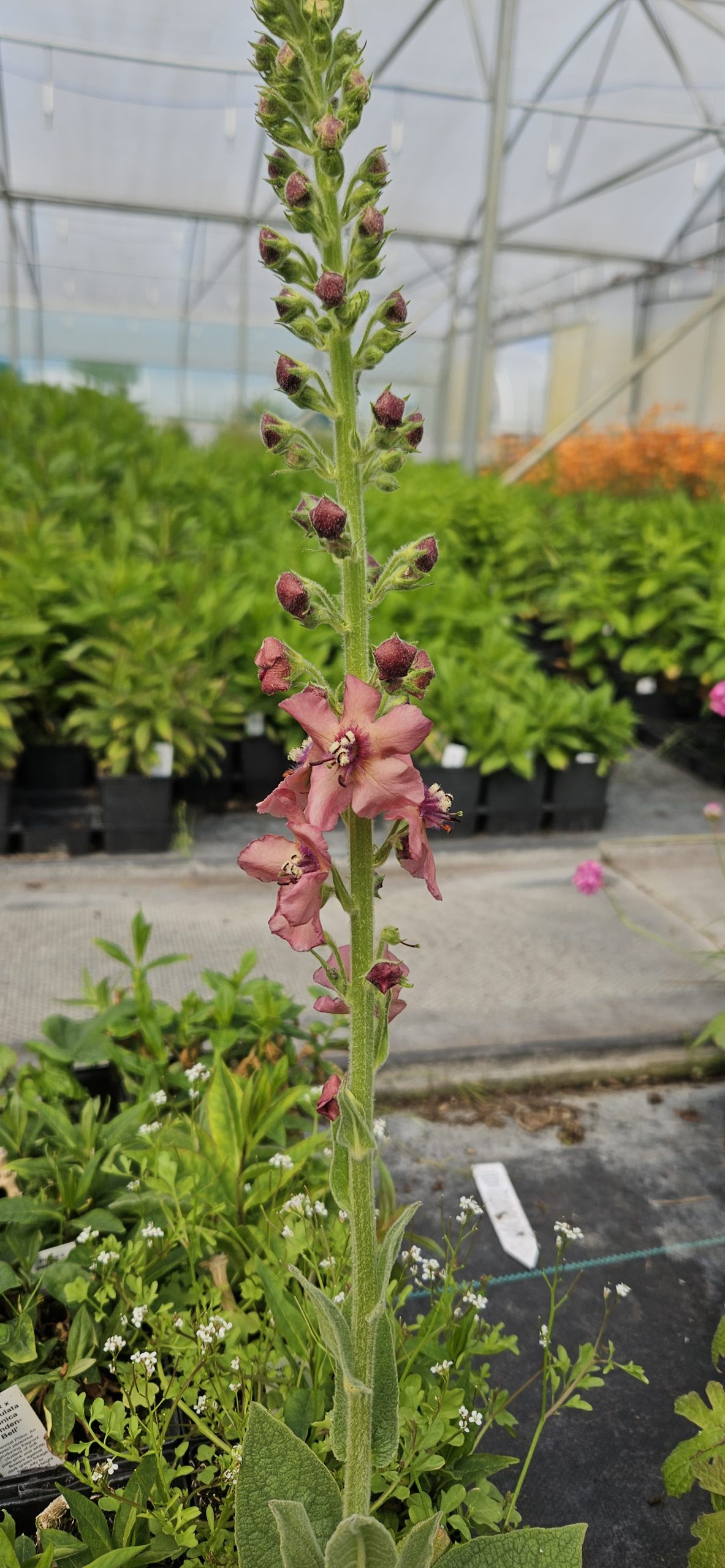 Mullein. A semi-evergreen perennial with rosettes of downy, grey-green leaves. Erect spikes of saucer-shaped light pinkish brown flowers with a purple eye in summer. Height 90cm. Spread 30cm. Flowers June to August. Full sun. Well drained soil. Hardy.