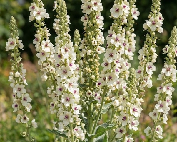 A semi-evergreen perennial with rosettes of downy, grey-green leaves. Tall spires are packed with ivory-white flowers with a purple centre in summer. Height 2m. Spread 1m. Flowers June to August. Full sun. Well drained soil. Hardy.