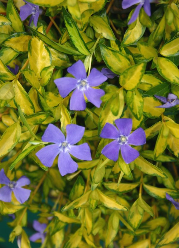 A vigorous, mat forming evergreen perennial with stunning golden variegated foliage. Fantastic cobalt blue periwinkle flowers in spring and summer. Height 15cm. Spread 50cm. Full sun/partial shade. Hardy.