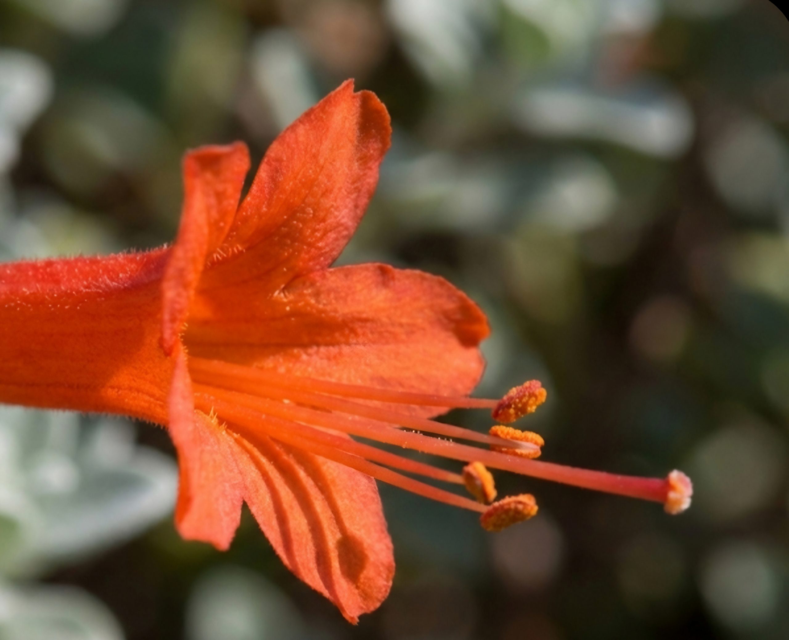 Californian Fuchsia. A woody-based perennial with grey-woolly leaves and funnel-shaped scarlet-red flowers in late summer and early autumn. Prefers full sun, or partial shade with free-draining soil or compost. Excellent for summer containers. Height 30cm. Spread 45cm. Hardy.